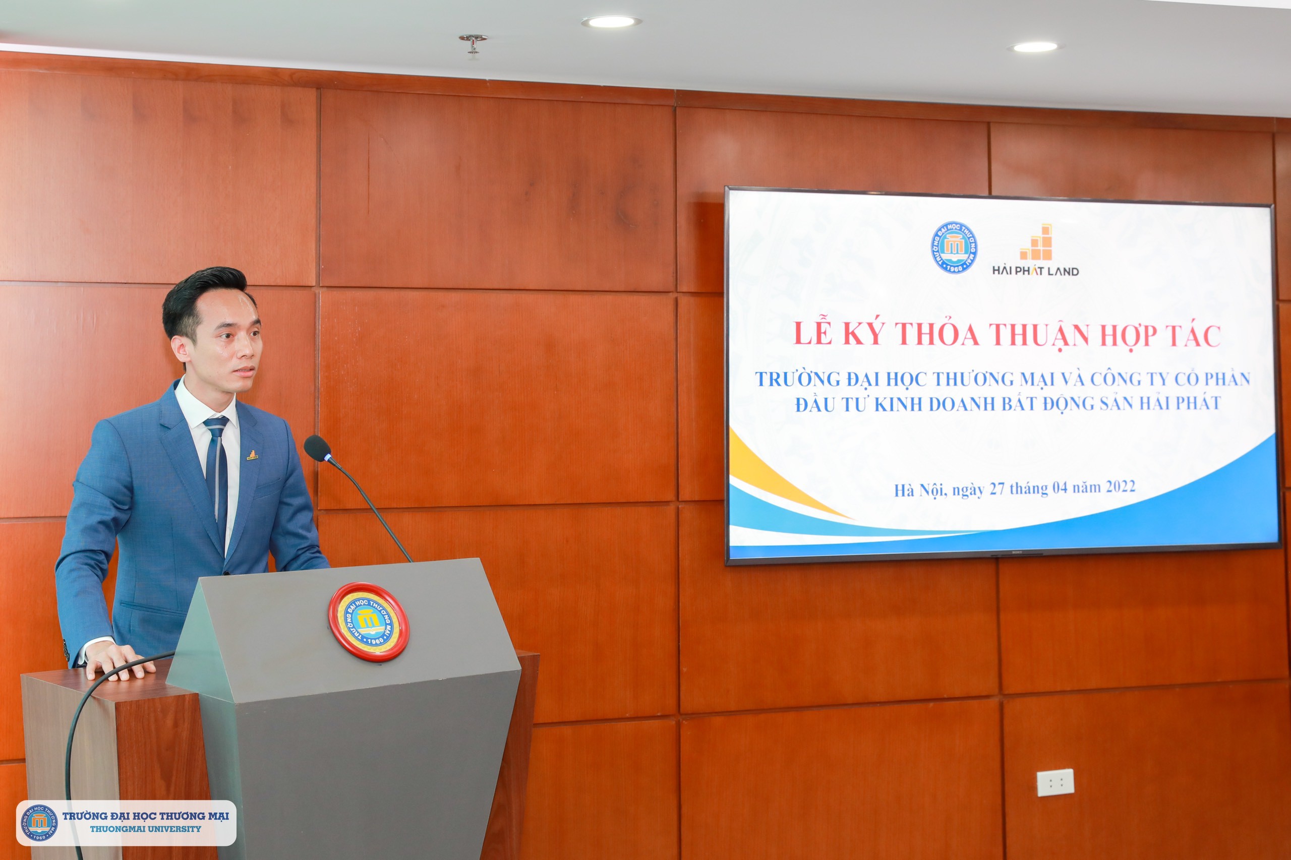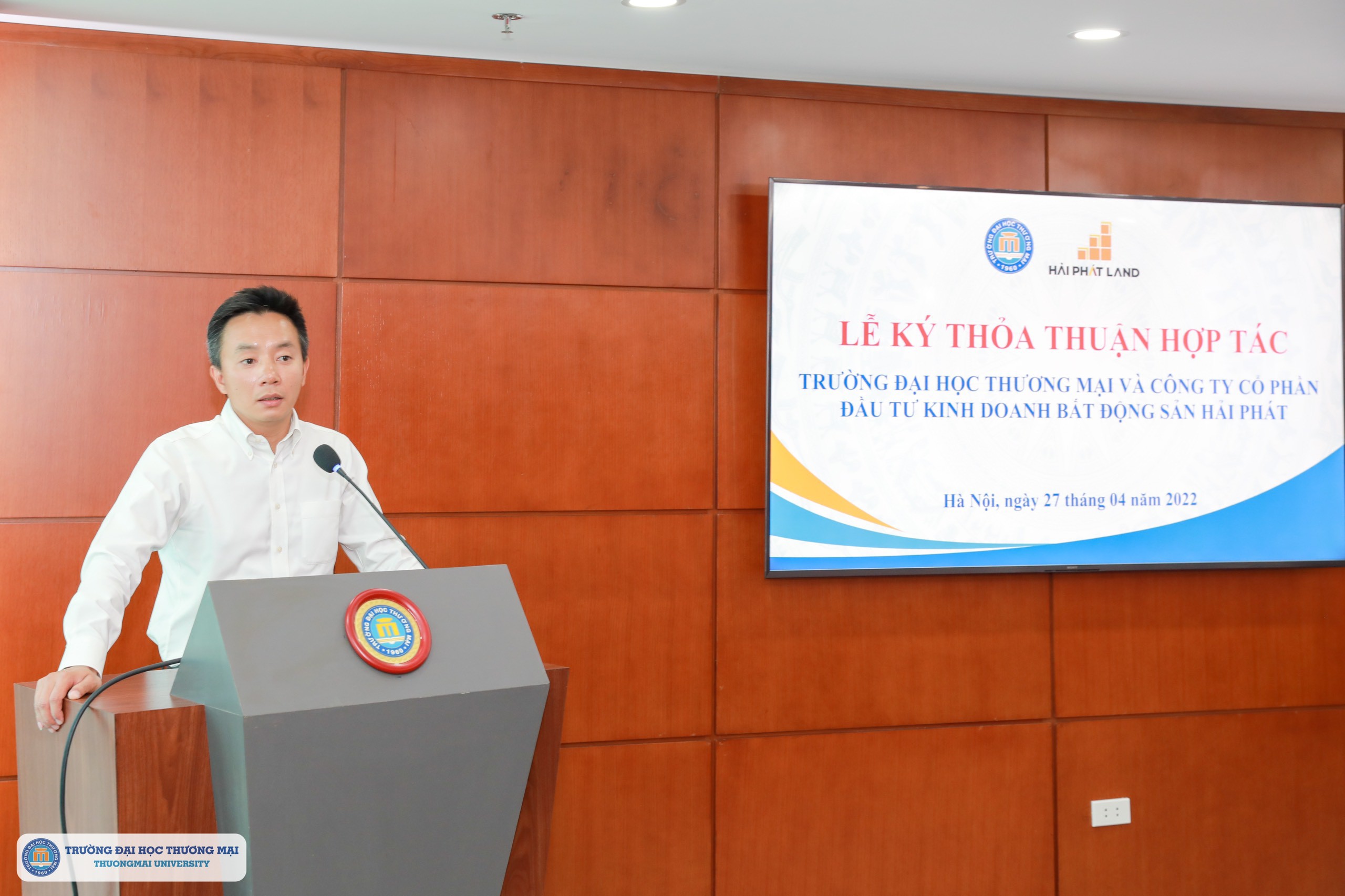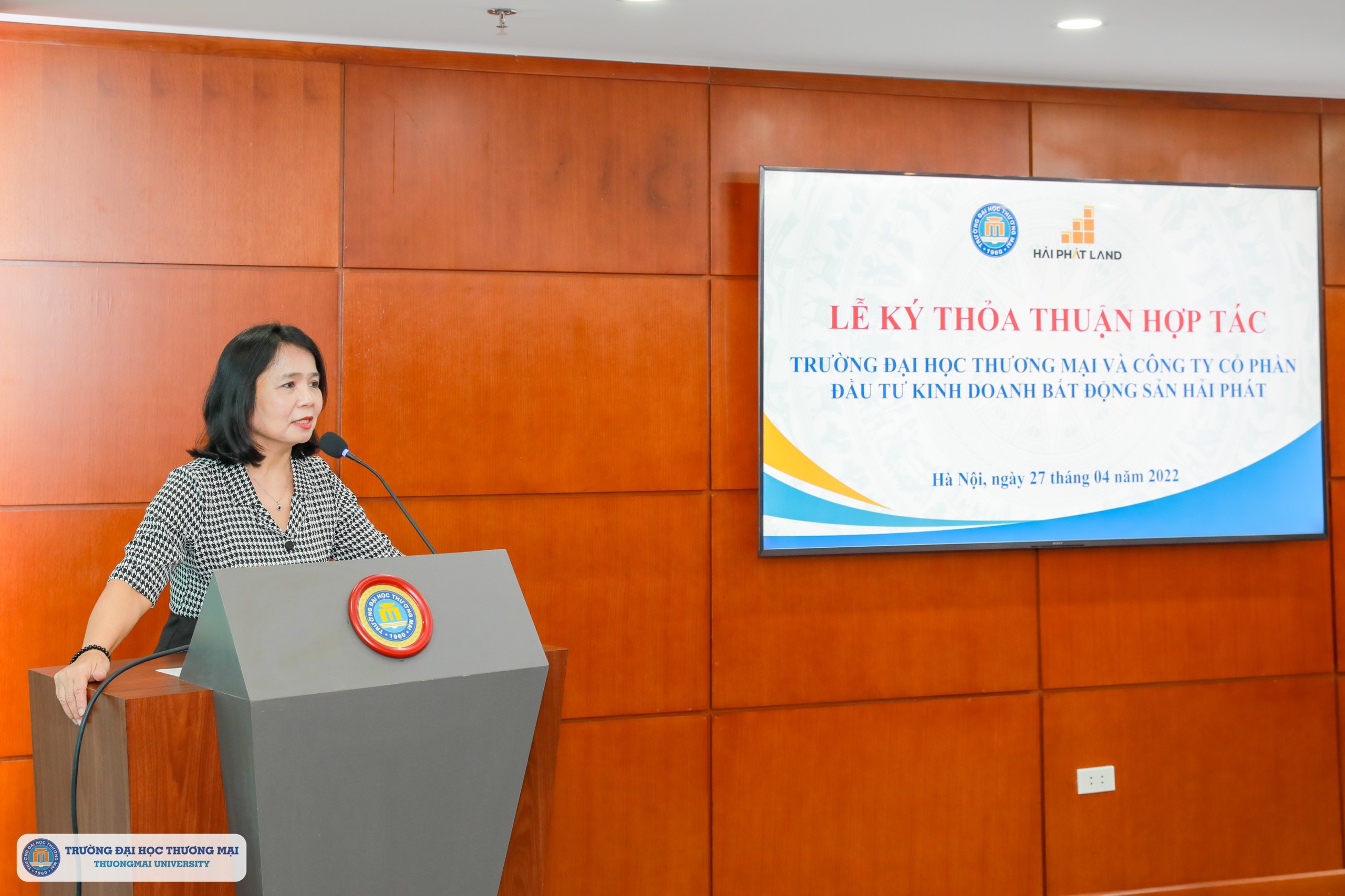 Tại buổi Lễ, PGS,TS. Nguyễn Thị Bích Loan – Phó Hiệu trưởng Trường Đại học Thương mại đã có những phát biểu bày tỏ sự tin tưởng, sự kiện ký thỏa thuận hợp tác giữa Công ty Cổ phần Đầu tư Kinh doanh Bất động sản Hải Phát và Trường Đại học Thương mại sẽ mở ra một cơ hội mới, bước phát triển mới cho mối quan hệ hợp tác giữa hai đơn vị, qua đó tạo ra những sản phẩm và bước tiến trong việc nâng cao chất lượng đào tạo, phát triển nguồn nhân lực, nghiên cứu khoa học…