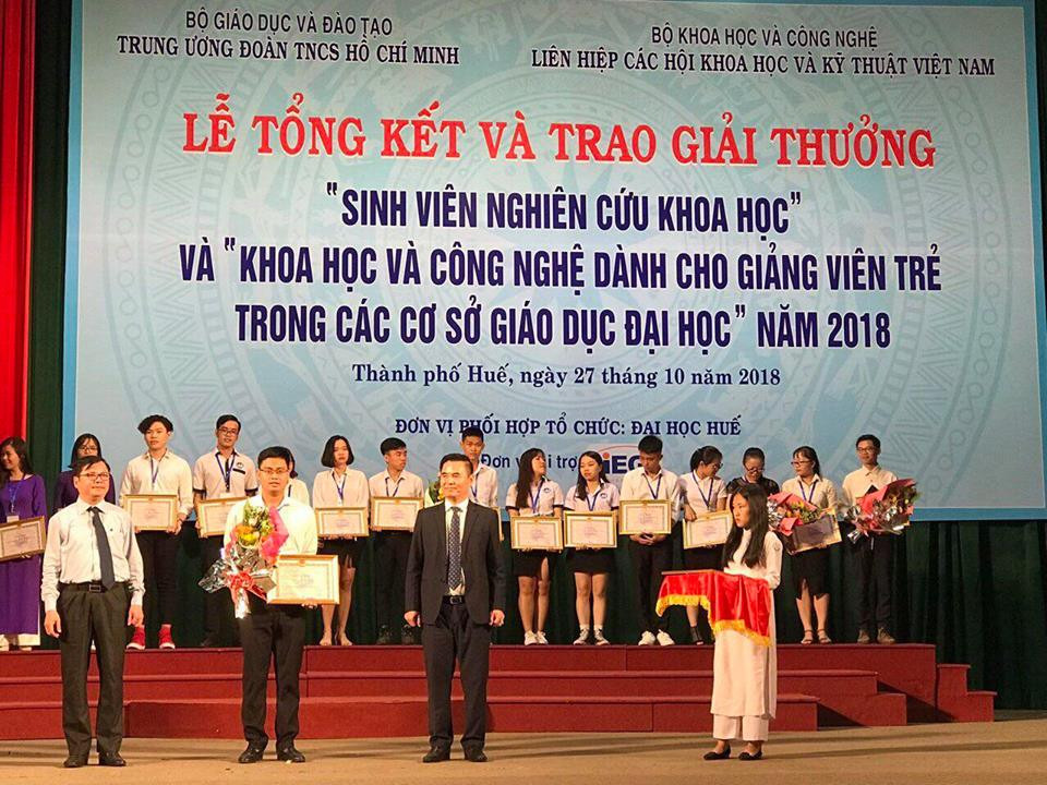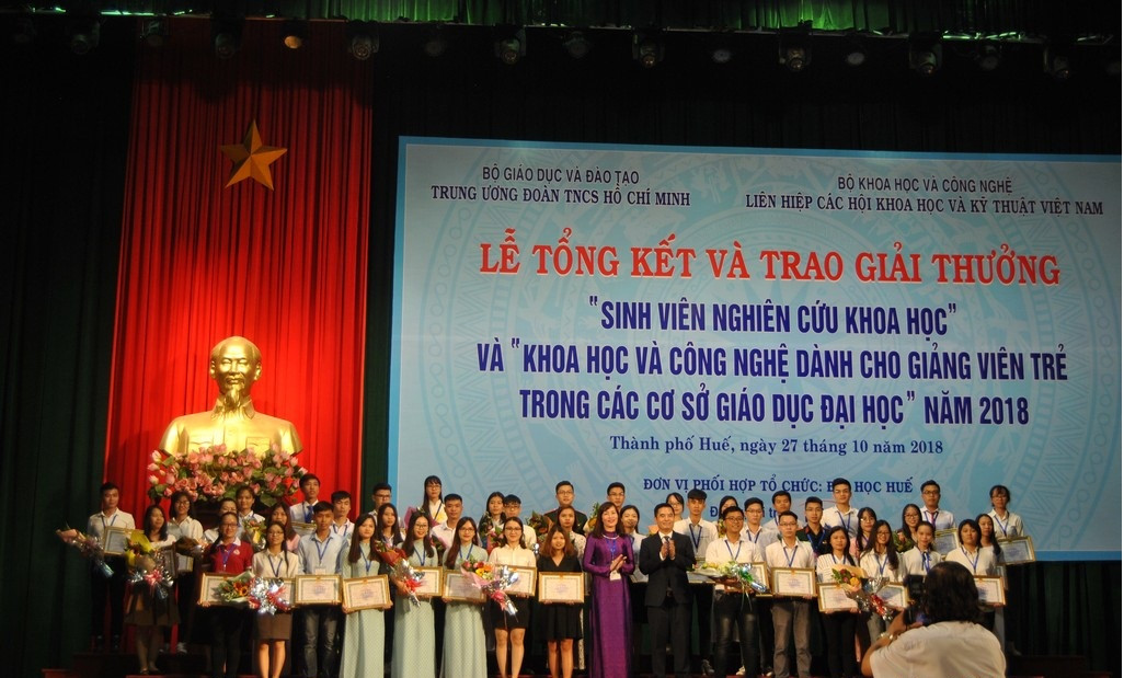 Chiều 27/10, tại Trung tâm Văn hóa Thông tin tỉnh Thừa Thiên Huế, Bộ GD&ĐT, Bộ Khoa học và Công nghệ, Trung ương Đoàn TNCS Hồ Chí Minh, Liên hiệp các Hội KHKT Việt Nam, Đại học Huế phối hợp tổ chức Lễ Tổng kết và trao thưởng “Sinh viên nghiên cứu khoa học” và “Khoa học - Công nghệ dành cho giảng viên trẻ” trong các cơ sở giáo dục đại học năm 2018.